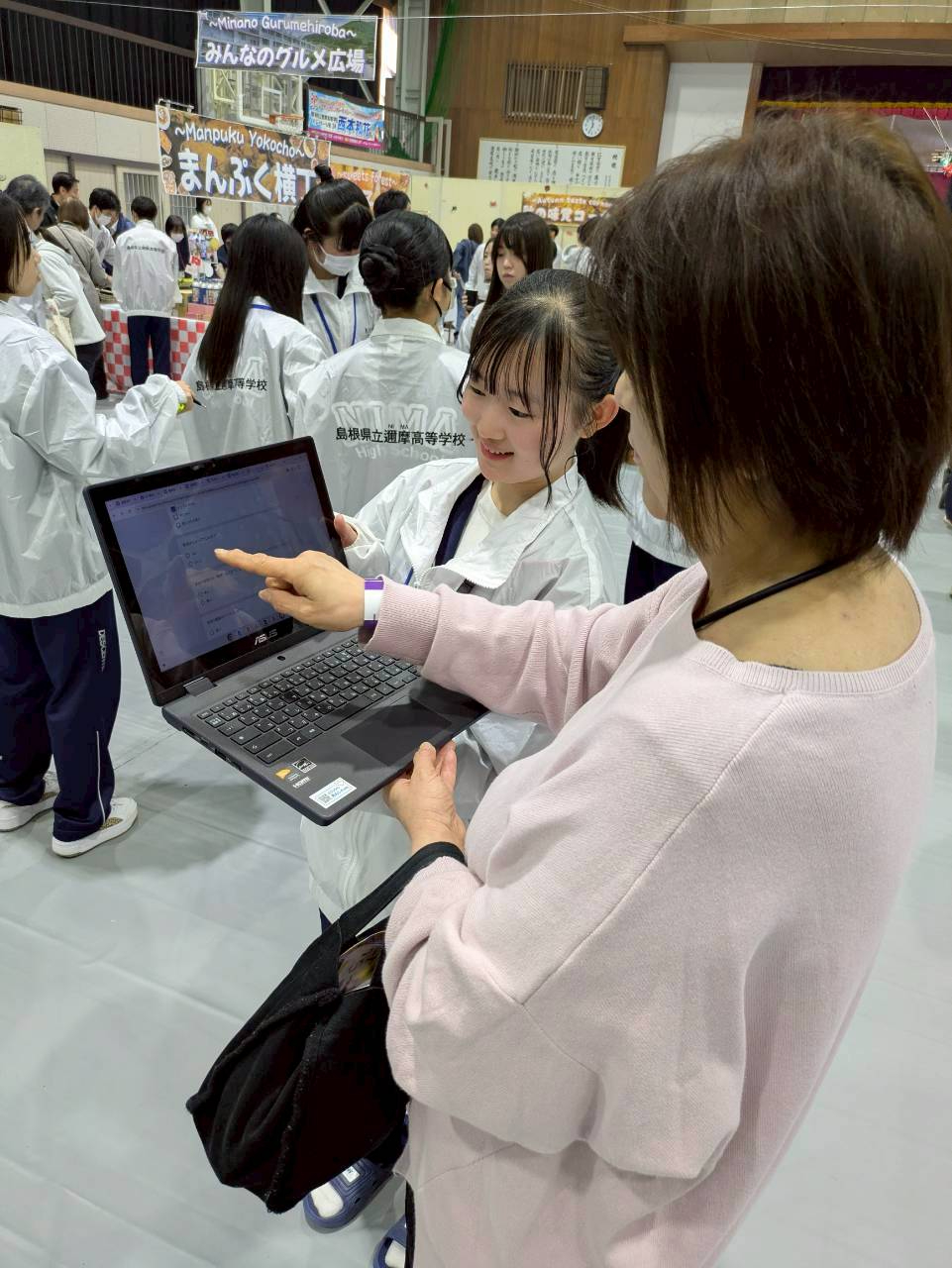 伝統を受け継ぐ邇摩高校の生徒たち。明るく看板を持って宣伝する生徒もいれば黙々とレジで会計をする人。それぞれの企画も工夫が感じられます。