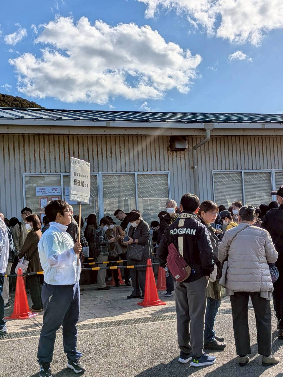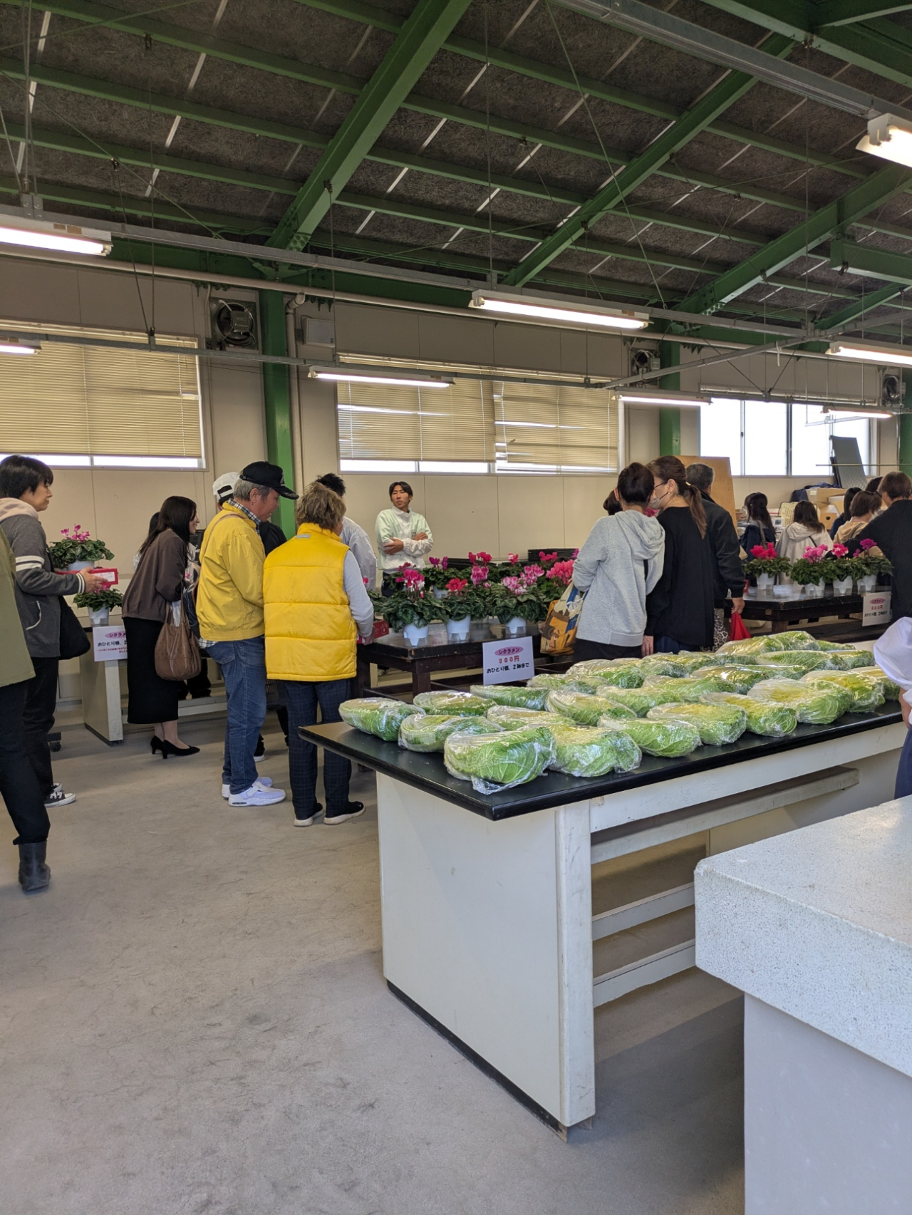 花や野菜などが販売されている農業実習室前には、オープン前から100人を超す長蛇の列!10人ずつの入場制限を設けて対応していました。シクラメンは格安で評価も高いため一度にたくさん買われる方も。1時間後に見に行くとかなり商品も減っていましたが、買い物に訪れる人は絶える様子はありません。