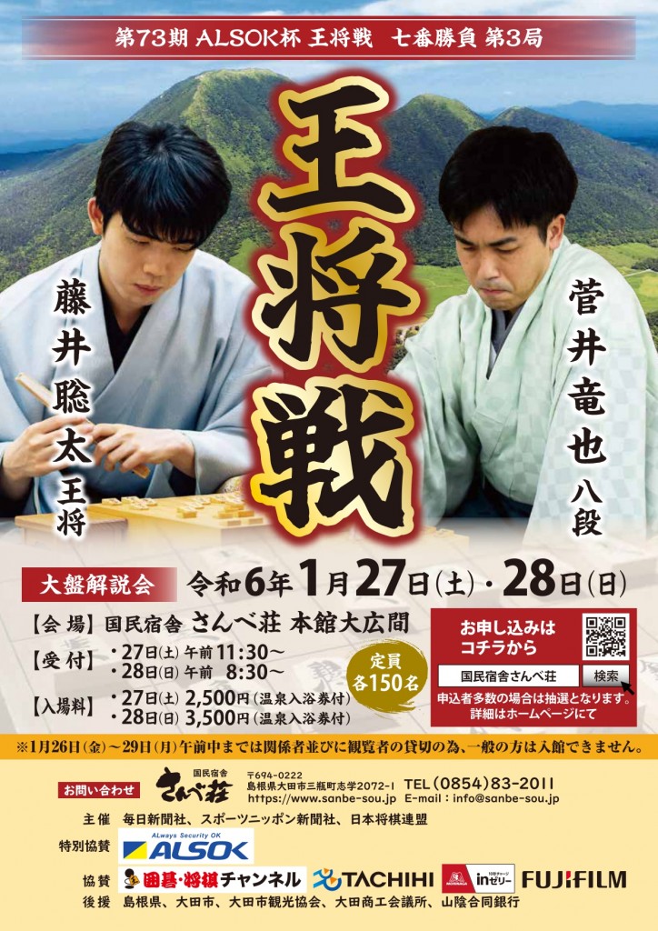 第73期ALSOK杯王将戦、藤井聡太王将と菅井竜也八段の七番勝負の第3局が1月27・28日両日に開催されます。
